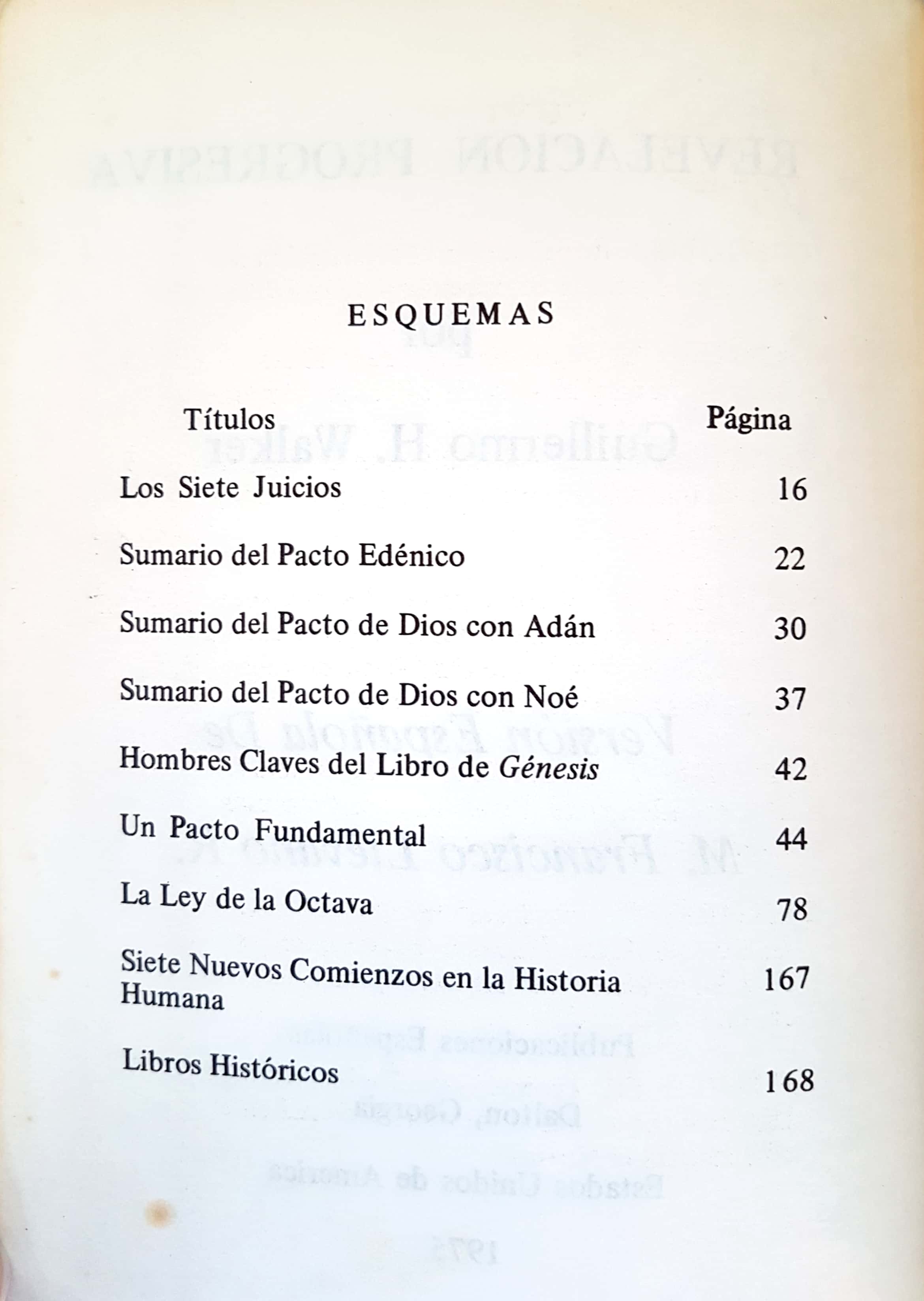 "Presento, pues, los capítulos de este libro sobre Revelación Progresiva, rogando a Dios con sincera esperanza que puedan servir para que la Biblia se haga más comprensible y útil en la formación de vdas para Cristo". Los capítulos abarcan los siguientes temas: Los 7 juicios. Pacto Edénico. Pacto de Dios con Noé. Claves del libro de Génesis. Un pacto fundamental. La ley de la Octava.
