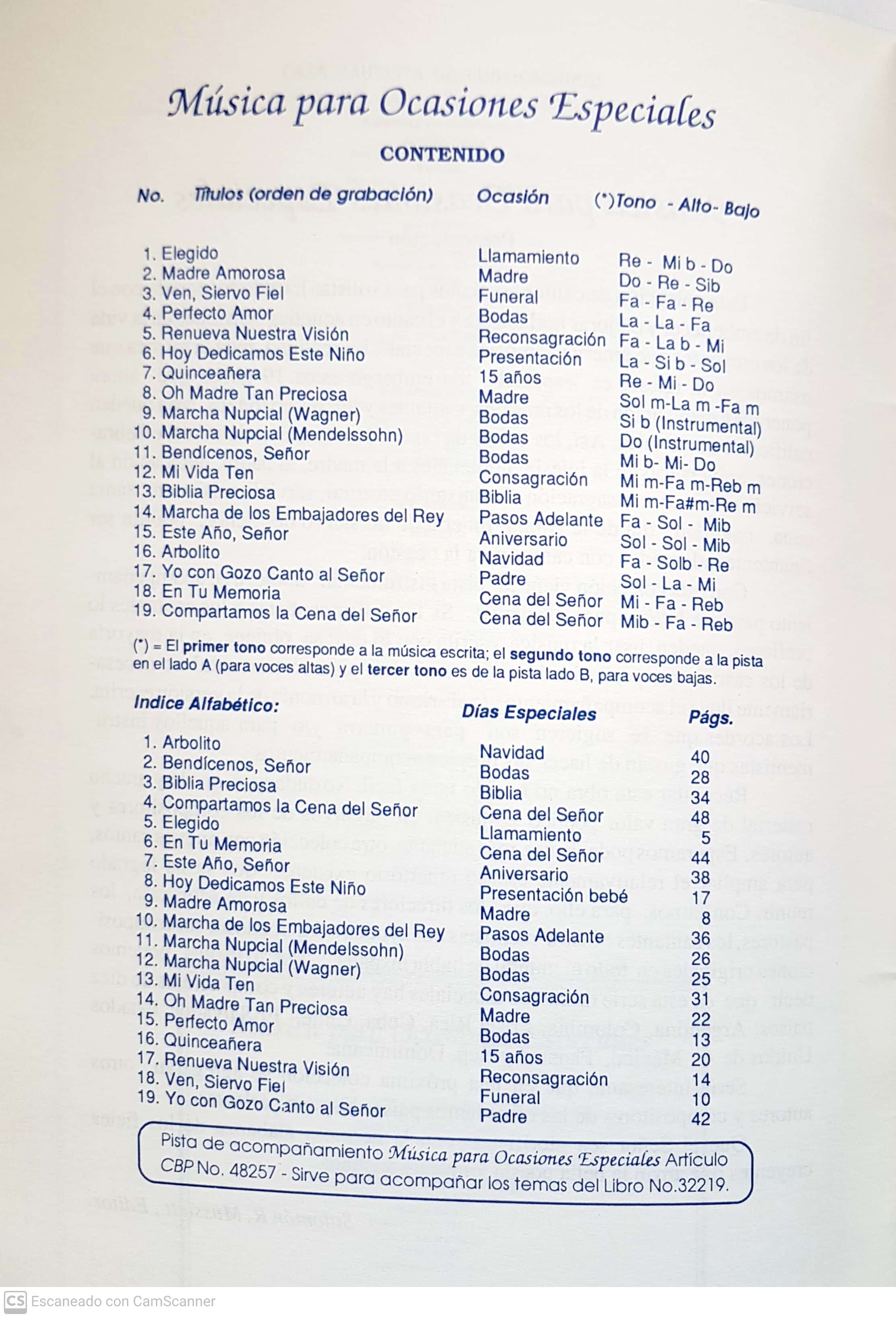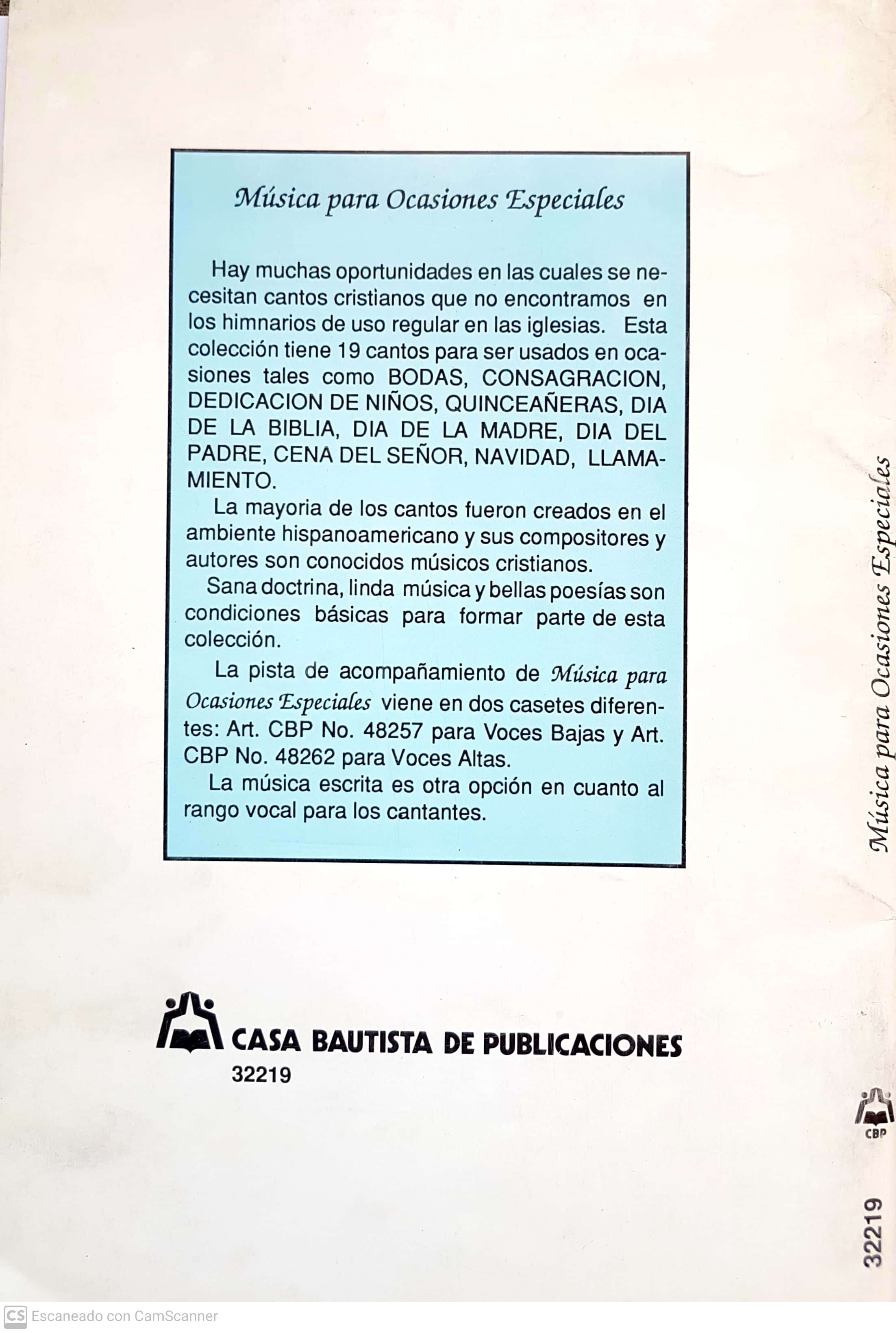 Hay muchas oportunidades en las cuales se necesitan cantos cristianos que no encontramos en los himnarios regular las iglesias. Esta colección tiene 19 cantos para ser usados en ocasiones tales como: Bodas, Consagración, Dedicación de niños, Quinceañeras, Día de la biblia, Día de madre, Día del padre, Cena del Señor, Navidad, Llamamiento.