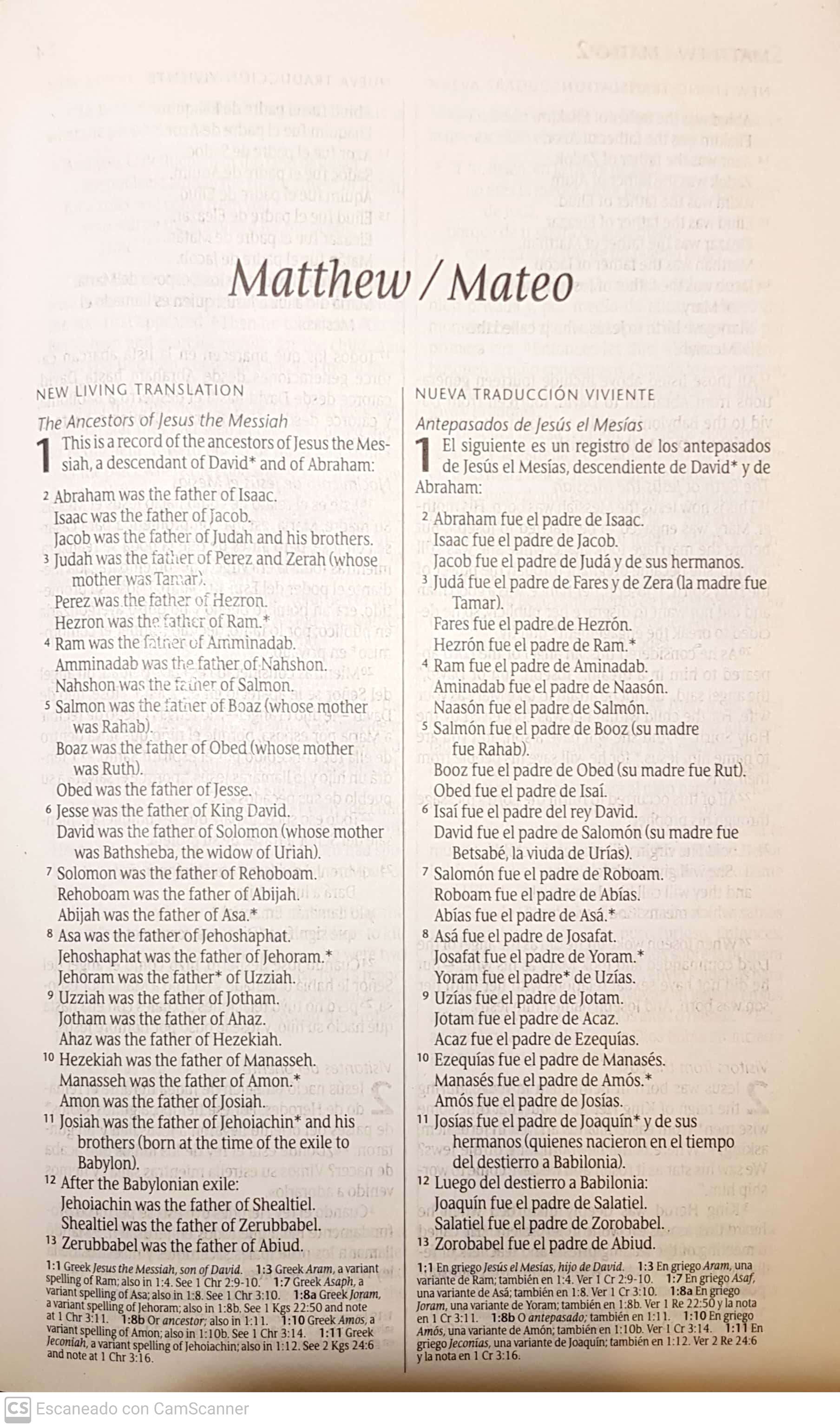 Nuevo Testamento bilingüe en inglés y español en 2 columnas por página. Versión en inglés: New Living Translation. Versión en español: Nueva Traducción Viviente.