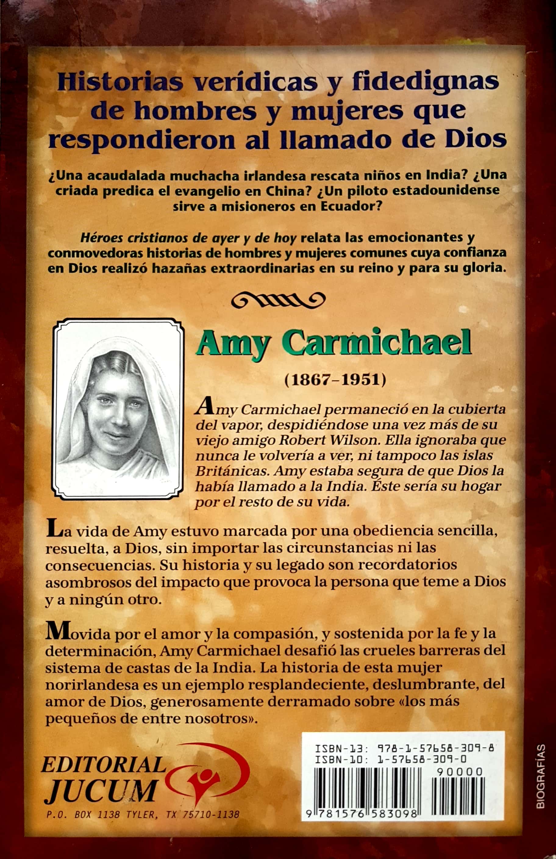 De la Serie: Héroes cristianos de ayer y hoy. La vida de Amy Carmichael, misionera en India. Movida por el amor y la compasión, y sostenida por la fe y la determinación, Amy Carmichael desafió las crueles barreras del sistema de castas de la India. La historia de esta mujer norirlandesa es un ejemplo resplandeciente, deslumbrante, del amor de Dios, generosamente derramado sobre "los más pequeños de entre nosotros".