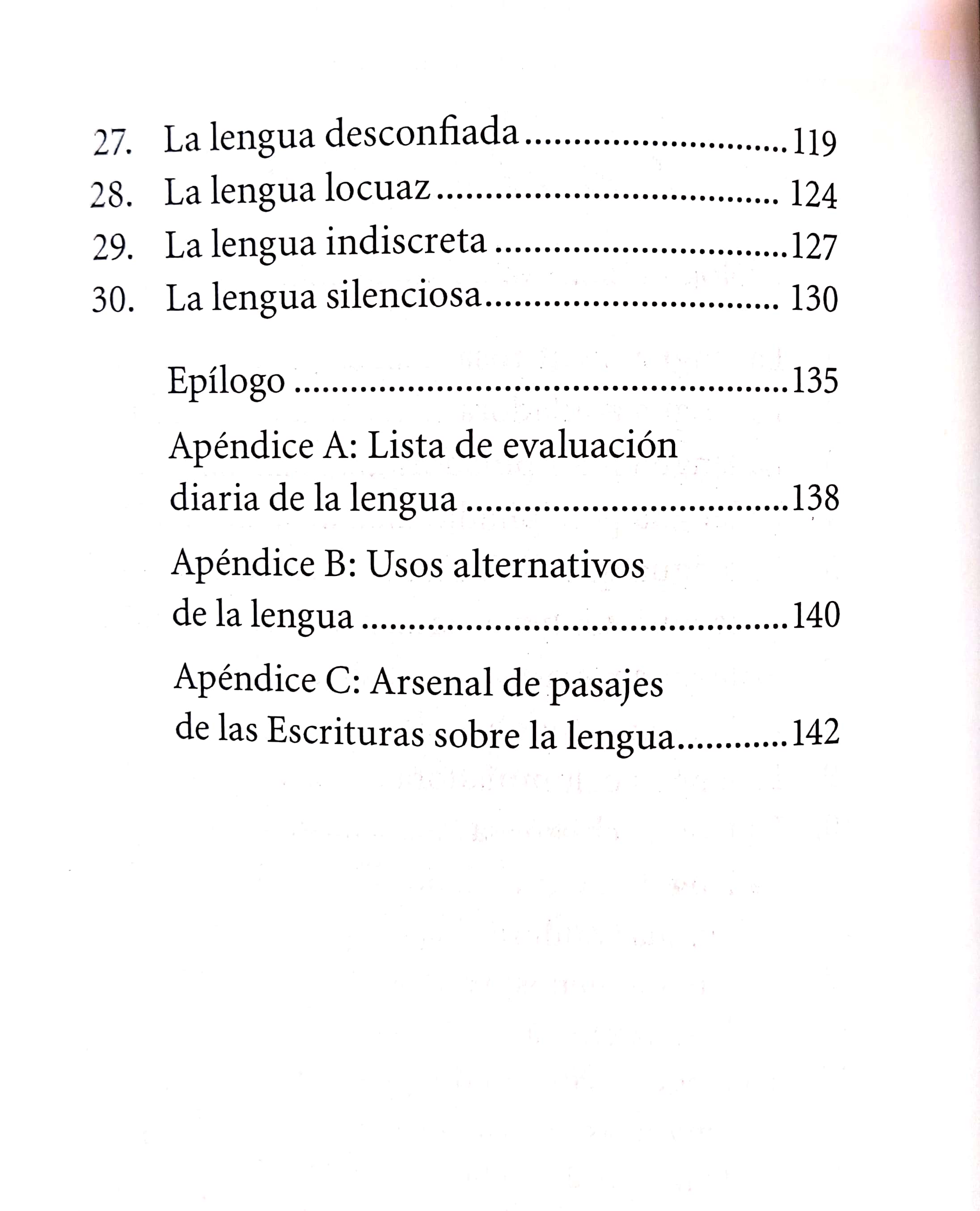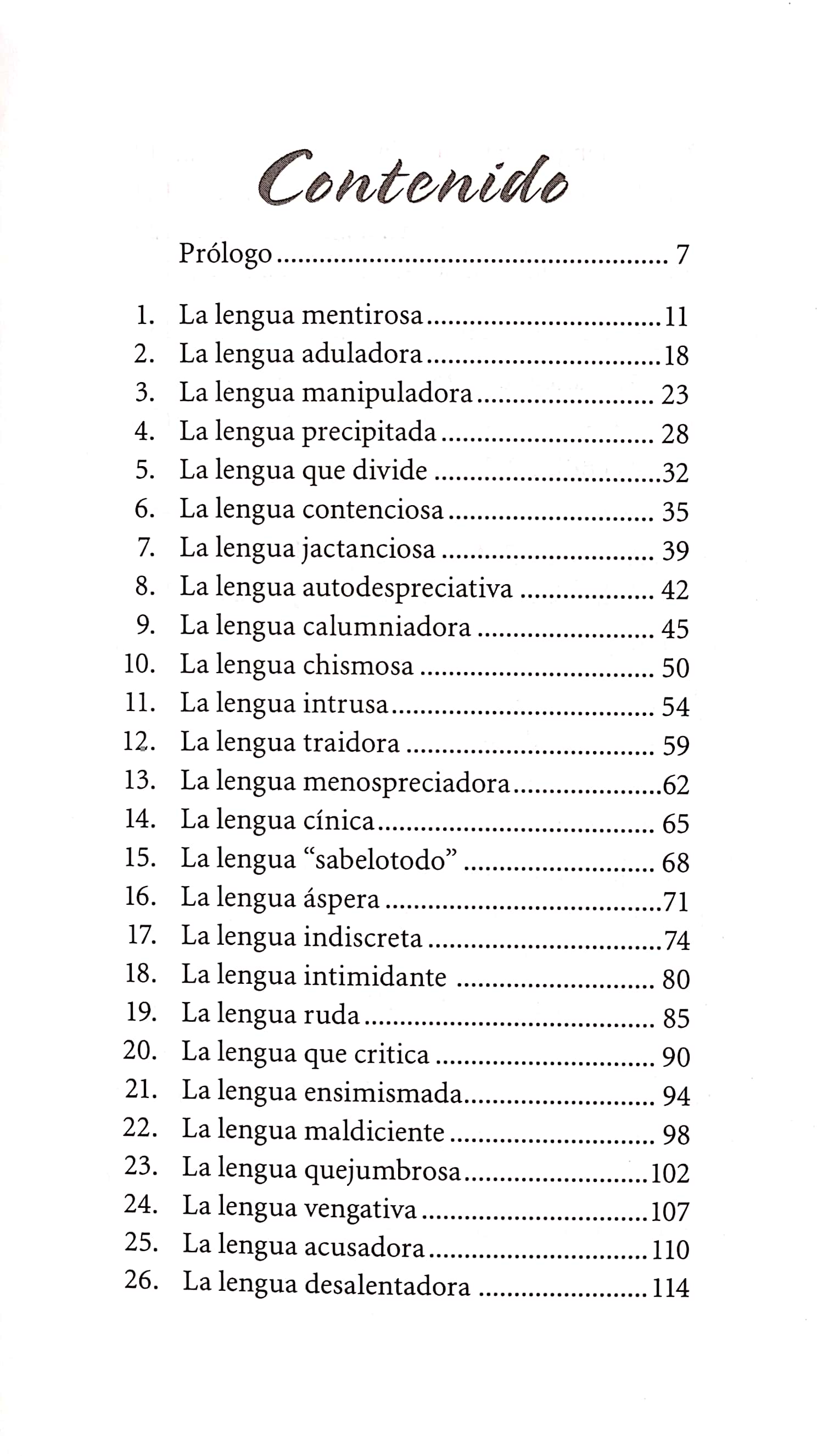 Con humor y claridad meridiana la autora le instruye cómo doblegar: La lengua vengativa, la lengua chismosa, la lengua precipitada, y 25 más.