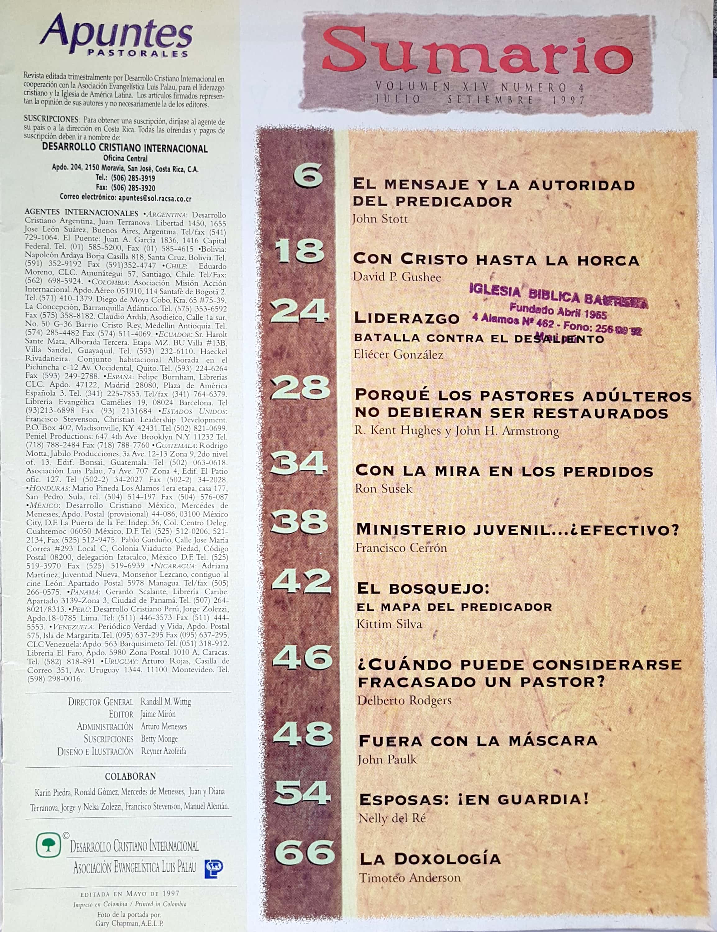 Revista Apuntes Pastorales. Incluye temas como: el mensaje y la autoridad del predicador, liderazgo, con la mira en los perdidos, entre otros.