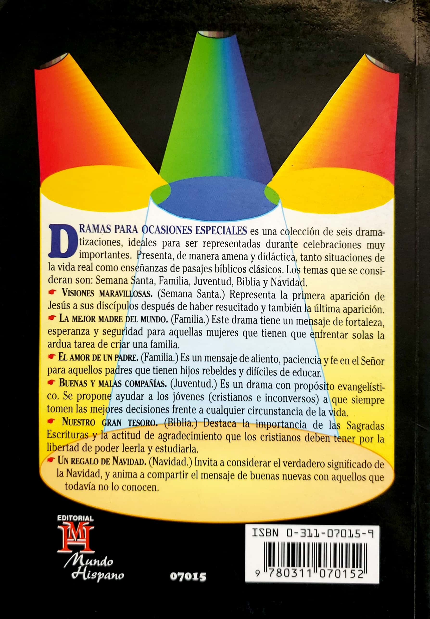 Dramas para ocasiones especiales es una colección de seis dramatizaciones, ideales para ser representadas durante celebraciones muy importantes. Presenta, de manera amena y didáctica, tanto situaciones de la vida real como enseñanzas de pasajes bíblicos clásicos. Los temas que se consideran son: Semana Santa, Familia, Juventud, Biblia y Navidad.