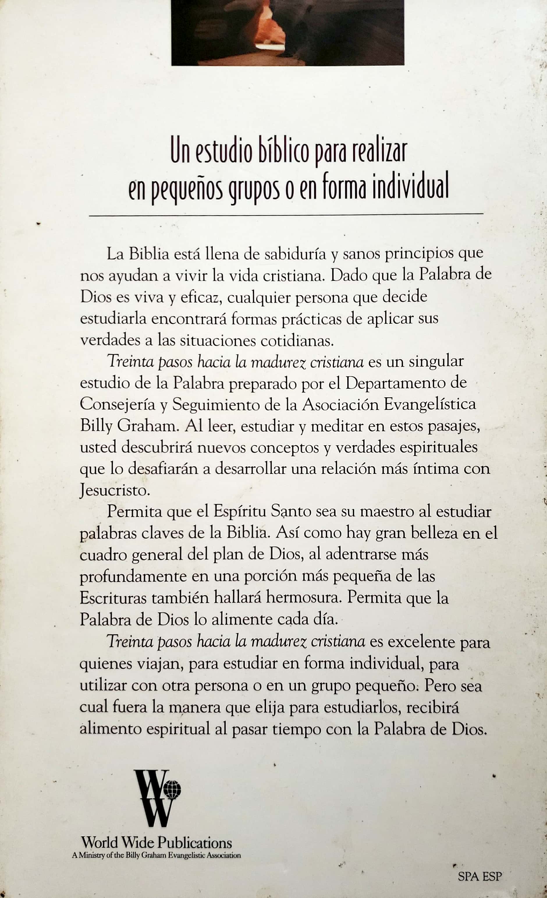 La Biblia está llena de sabiduría y sanos principios que nos ayudan a vivir la vida cristiana. Dado que la Palabra de Dios es viva y eficaz, cualquier persona que decide estudiarla encontrará formas prácticas de aplicar sus verdades a las situaciones cotidianas. Treinta pasos hacia la madurez cristiana es un singular estudio de la Palabra preparado por el Departamento de Consejería y Seguimiento de la Asociación Evangelística Billy Graham. Al leer, estudiar y meditar en estos pasajes, usted descubrirá nuevos conceptos y verdades espirituales que lo desafiarán a desarrollar una relación más íntima con Jesucristo.
