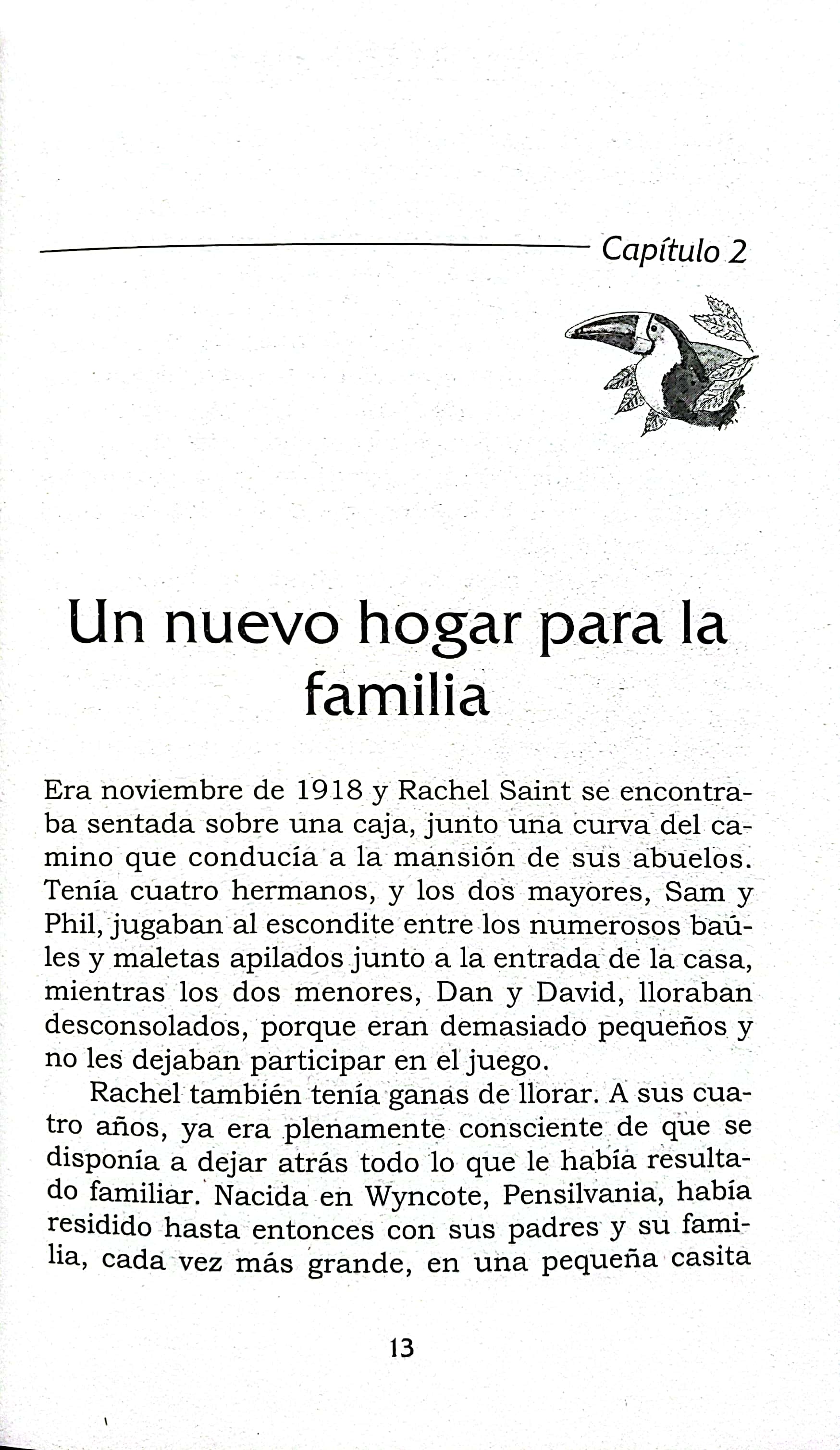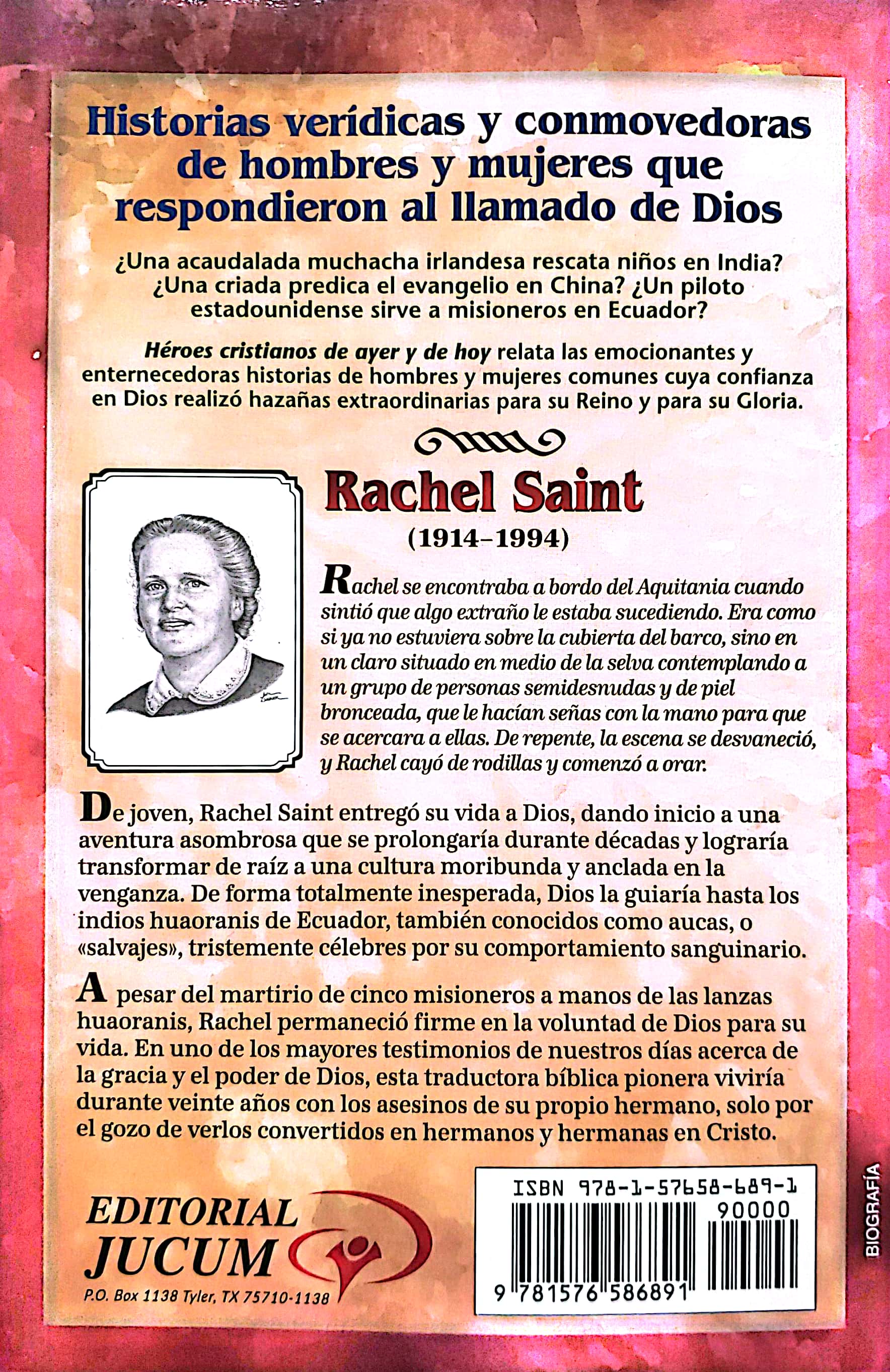 De la Serie: Héroes cristianos de ayer y hoy. Rachel se encontraba a bordo del Aquitania cuando sintió que algo extraño le estaba sucediendo. Era como si ya no estuviera sobre la cubierta del barco, sino en un claro situado en medio de la selva contemplando a un grupo de personas semidesnudas y de piel bronceada, que le hacían señas con la mano para que se acercara a ellas. De repente, la escena se desvaneció, y Rachel cayó de rodillas y comenzó a orar. De joven, Rachel Saint entregó su vida a Dios, dando inicio a una aventura asombrosa que se prolongaría durante décadas y lograría transformar de raíz a una cultura moribunda y anclada en la venganza. De forma totalmente inesperada, Dios la guiaría hasta los indios huaoranis de Ecuador, también conocidos como aucas, o «salvajes», tristemente célebres por su comportamiento sanguinario. A pesar del martirio de cinco misioneros a manos de las lanzas huaoranis, Rachel permaneció firme en la voluntad de Dios para su vida. En uno de los mayores testimonios de nuestros días acerca de la gracia y el poder de Dios, esta traductora bíblica pionera viviría durante veinte años con los asesinos de su propio hermano, solo por el gozo de verlos convertidos en hermanos y hermanas en Cristo (1914-1994).