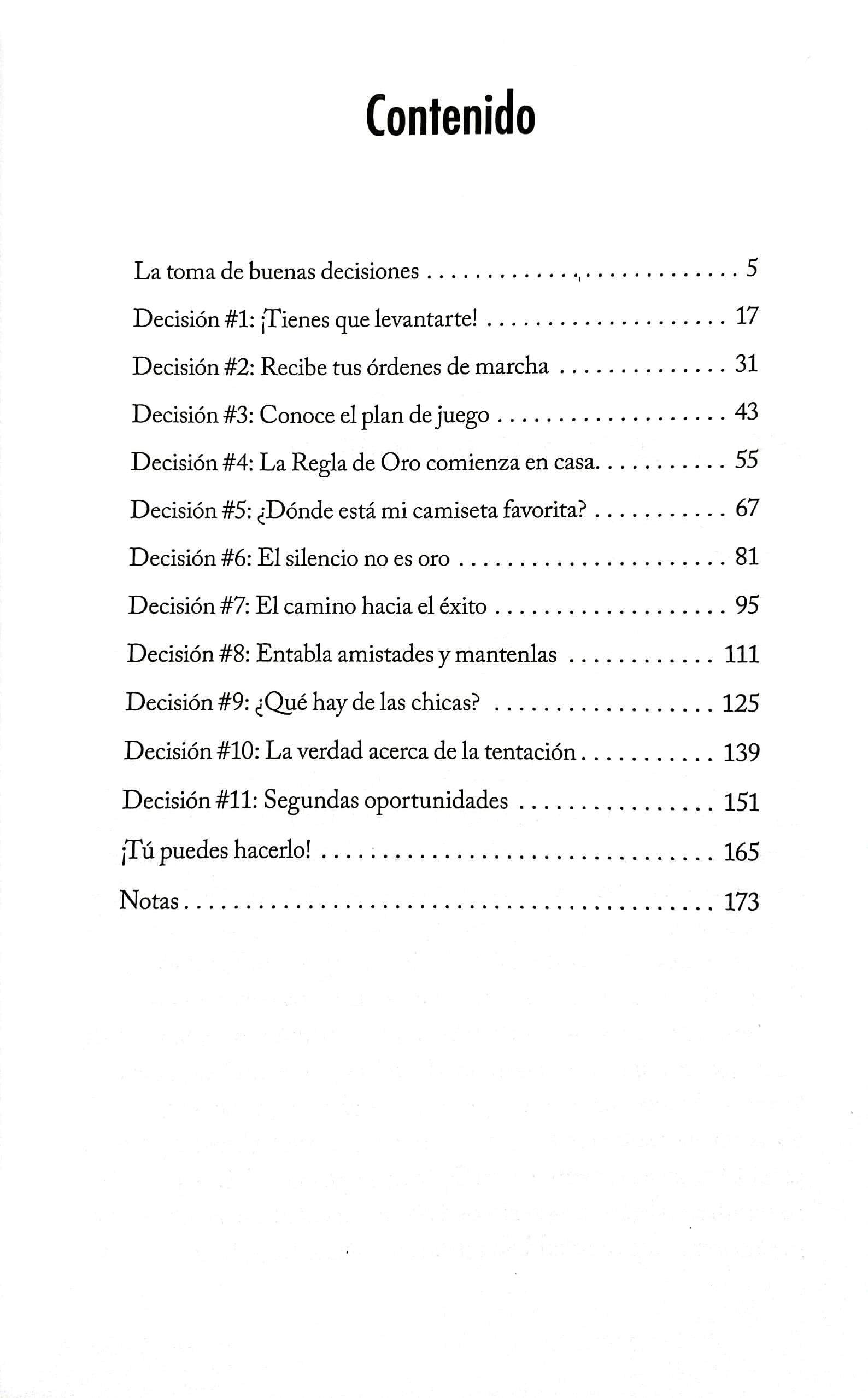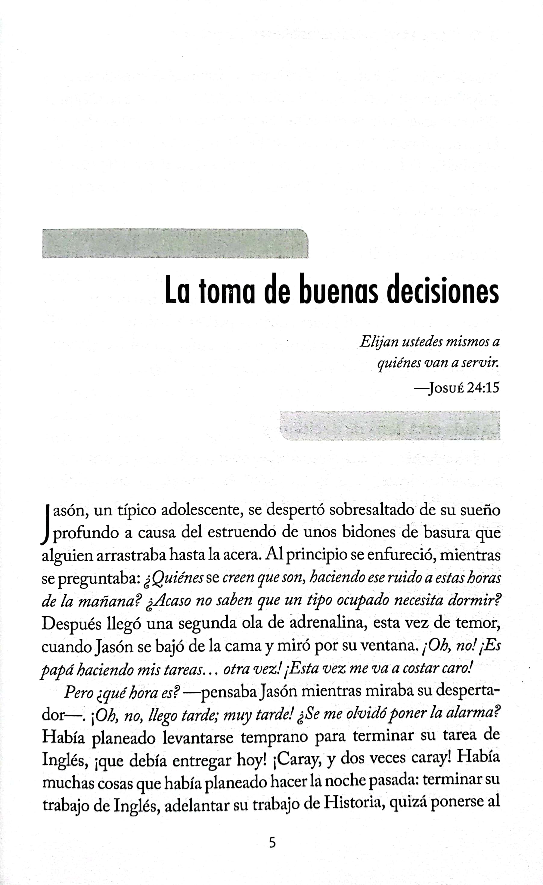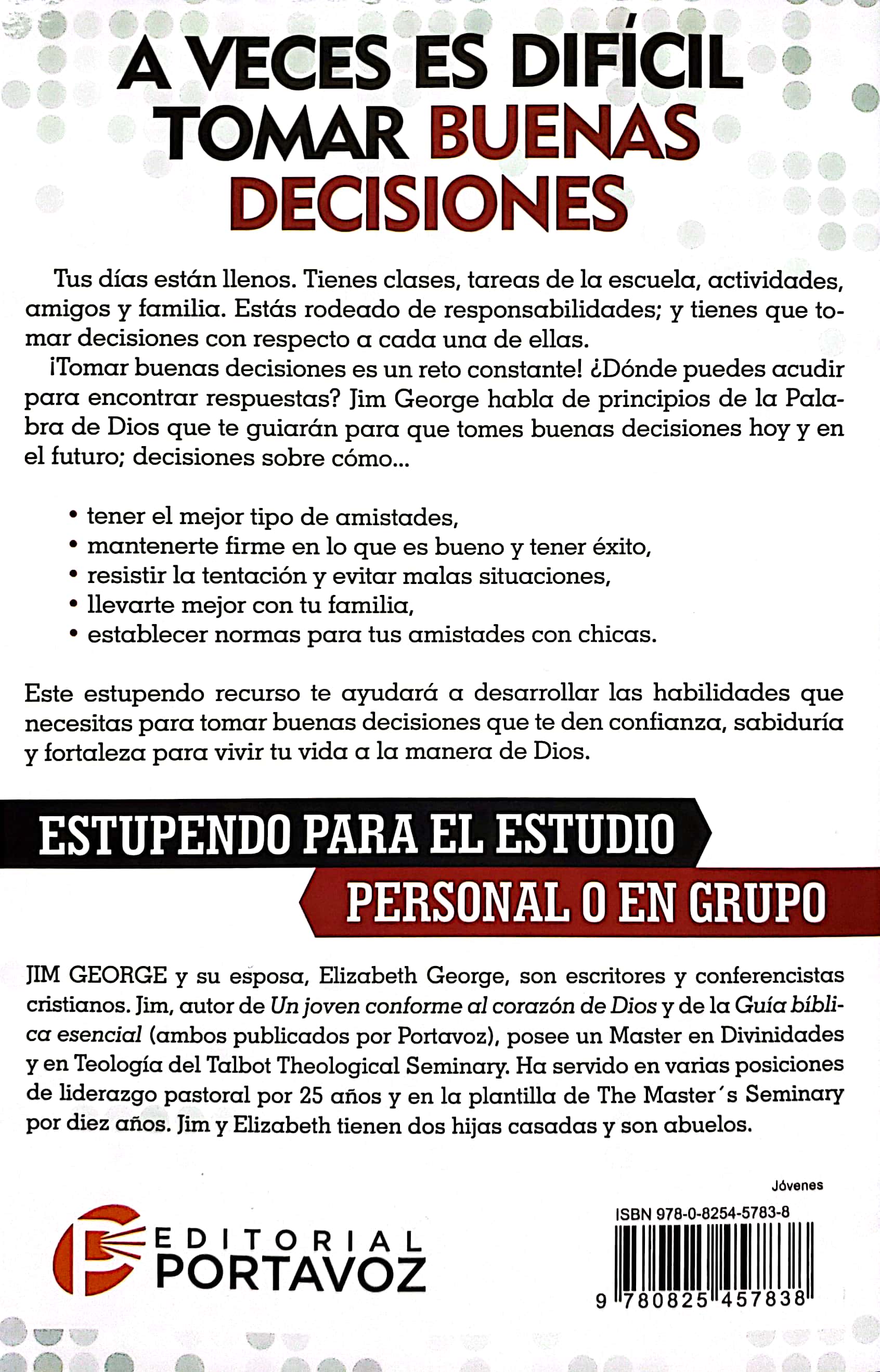 Tus días están llenos. Tienes clases, tareas de la escuela, actividades, amigos y familia. Estás rodeado de responsabilidades; y tienes que tomar decisiones con respecto a cada una de ellas. ¡Tomar buenas decisiones es un reto constante! ¿Dónde puedes acudir para encontrar respuestas? Jim George habla de principios de la Palabra de Dios que te guiarán para que tomes buenas decisiones hoy y en el futuro; decisiones sobre cómo... - tener el mejor tipo de amistades, - mantenerte firme en lo que es bueno y tener éxito, - resistir la tentación y evitar malas situaciones, - llevarte mejor con tu familia, - establecer normas para tus amistades con chicas. Este estupendo recurso te ayudará a desarrollar las habilidades que necesitas para tomar buenas decisiones que te den confianza, sabiduría y fortaleza para vivir tu vida a la manera de Dios.