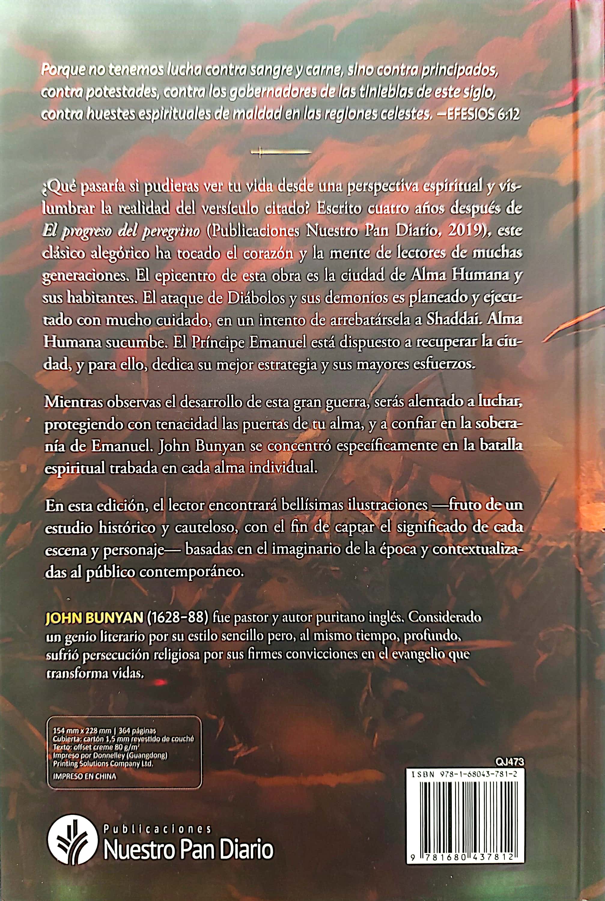 ¿Qué pasaría si pudieras ver tu vida desde una perspectiva espiritual y vislumbrar la realidad del versículo citado? Escrito cuatro años después de El progreso del peregrino, este clásico alegórico ha tocado el corazón y la mente de lectores de muchas generaciones. El epicentro de esta obra es la ciudad de Alma Humana y sus habitantes. El ataque de Diábolos y sus demonios es planeado y ejecutado con mucho cuidado, en un intento de arrebatársela a Shaddai. Alma Humana sucumbe. El Príncipe Emanuel está dispuesto a recuperar la ciudad, y para ello, dedica su mejor estrategia y sus mayores esfuerzos. Mientras observas el desarrollo de esta gran guerra, serás alentado a luchar, protegiendo con tenacidad las puertas de tu alma, y a confiar en la soberanía de Emanuel. John Bunyan se concentró específicamente en la batalla espiritual trabada en cada alma individual. En esta edición, el lector encontrará bellísimas ilustraciones —fruto de un estudio histórico y cauteloso, con el fin de captar el significado de cada escena y personaje— basadas en el imaginario de la época y contextualizadas al público contemporáneo.