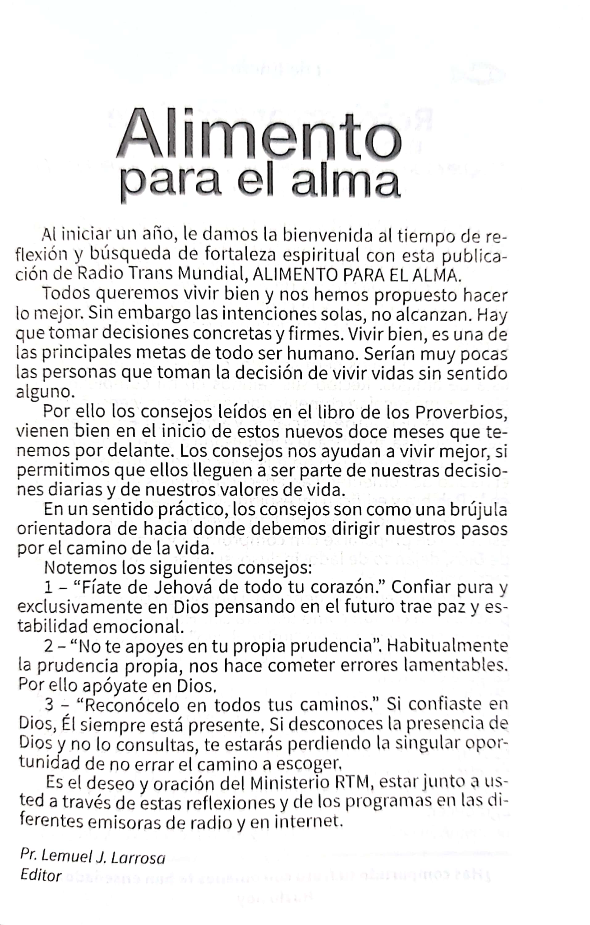 Un libro devocional para todo el año. Este libro es una publicación de Radio Trans Mundial, que viene a refrescar nuestras almas y nos trae fortaleza espiritual y esperanza. Naveguemos en las aguas profundas del amor de Dios día tras día.