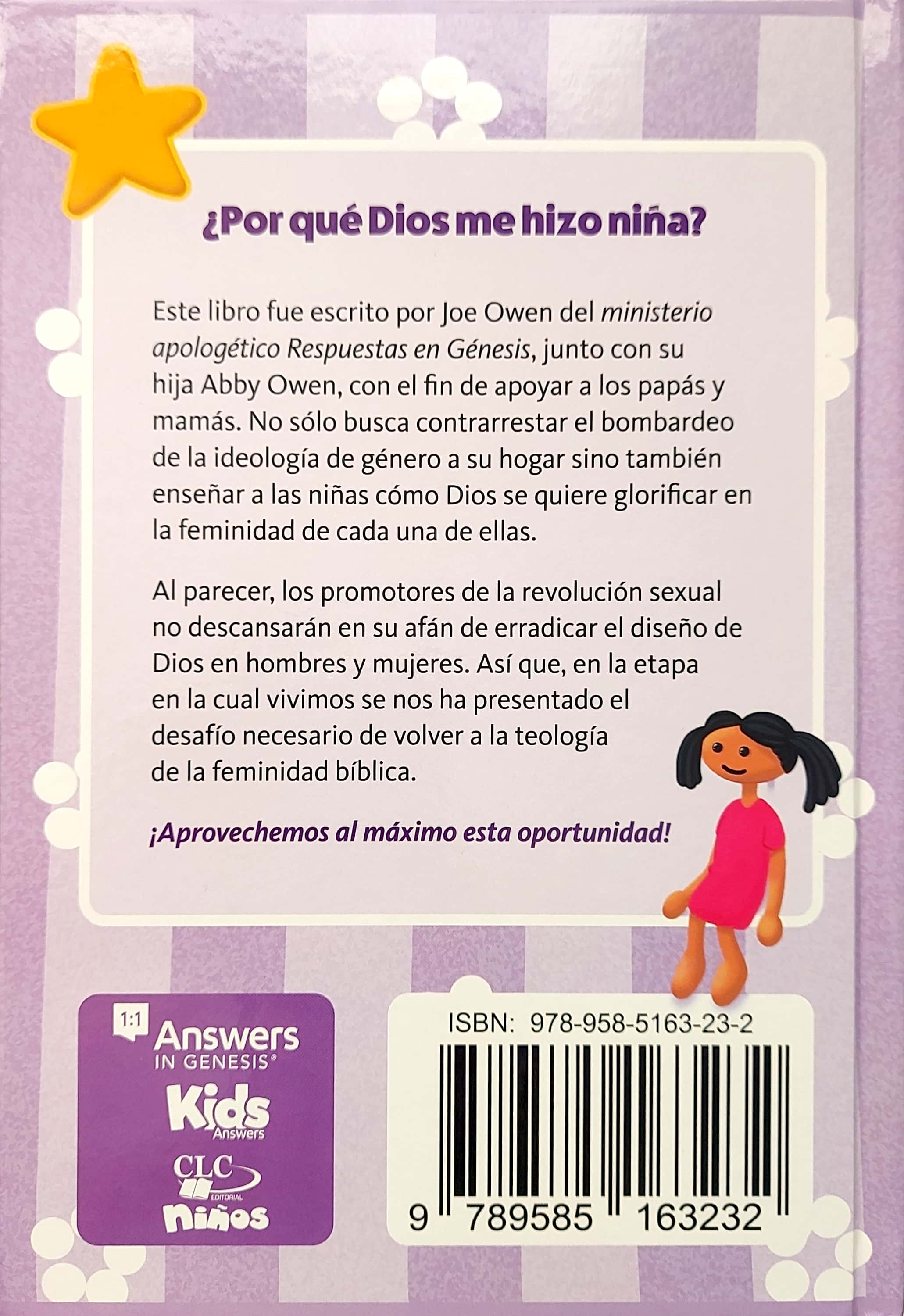 Este libro, ¿Por qué Dios me hizo niña? fue escrito por Joe Owen del ministerio apologético Respuéstas en Génesis, junto con su hija Abby Owen, con el fin de apoyar a los papás y mamás no solo para contrarrestar el bombardeo de la ideología de género a su hogar, sino también para enseñar a los niños cómo Dios se quiere glorificar en su respectiva feminidad. También este libro presenta el mensaje de la redención de Cristo y de cómo solo en Él y por Él, podemos vivir los apectos estructurales y funcionales de la imagen de Dios en nosotros para la gloria de Dios en Cristo.