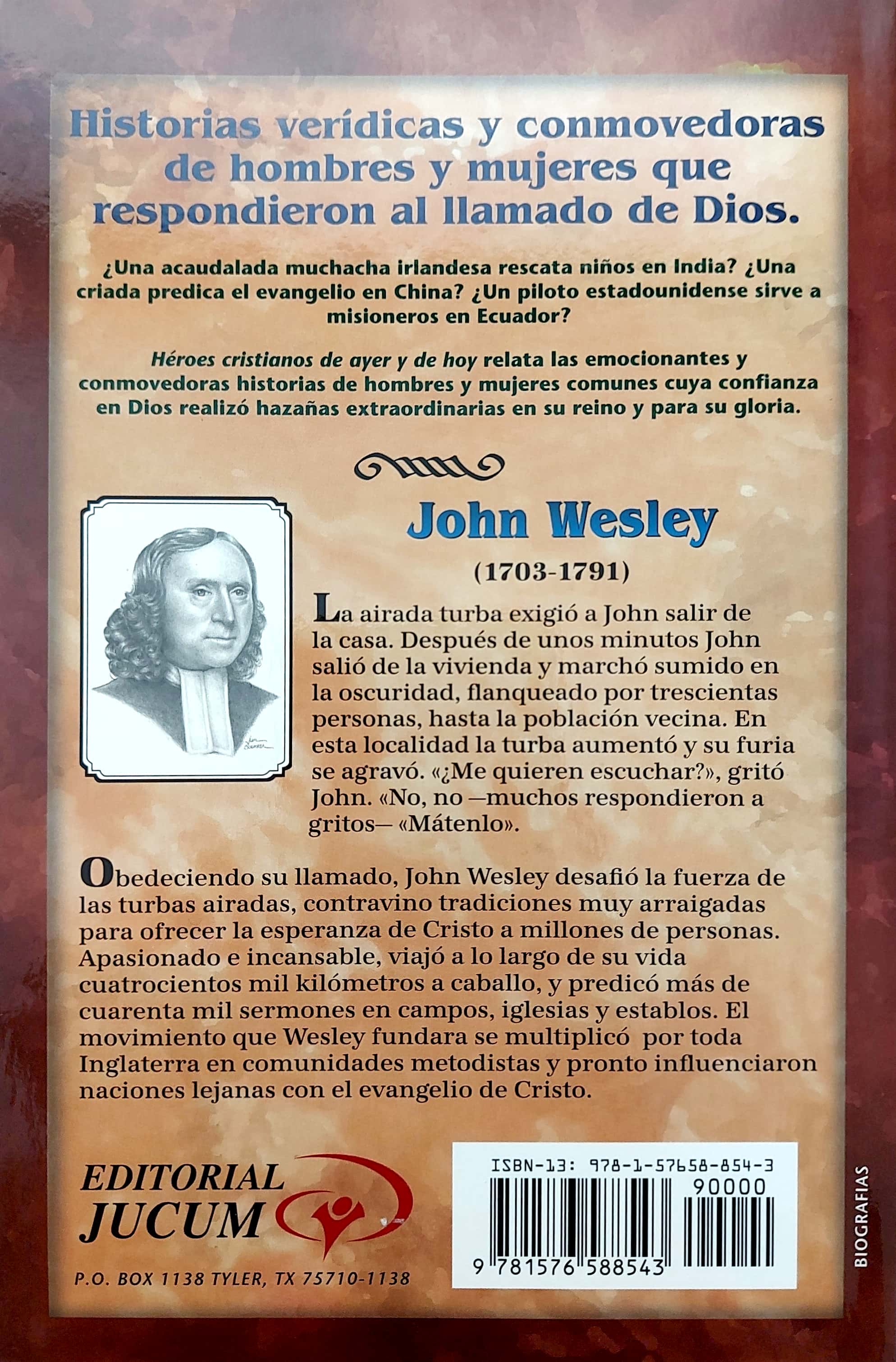 Este libro pertenece a la Colección Héroes cristianos de ayer y hoy. Obedeciendo su llamado, John Wesley desafió la fuerza de las turbas airadas, contravino tradiciones muy arraigadas para ofrecer la esperanza de Cristo a millones de personas. Apasionado e incansable, viajó a lo largo de su vida cuatrocientos mil kilómetros a caballo, y predicó más de cuarenta mil sermones en campos, iglesias y establos. El movimiento que Wesley fundara se multiplicó por toda Inglaterra en comunidades metodistas y pronto influenciaron naciones lejanas con el evangelio de Cristo.