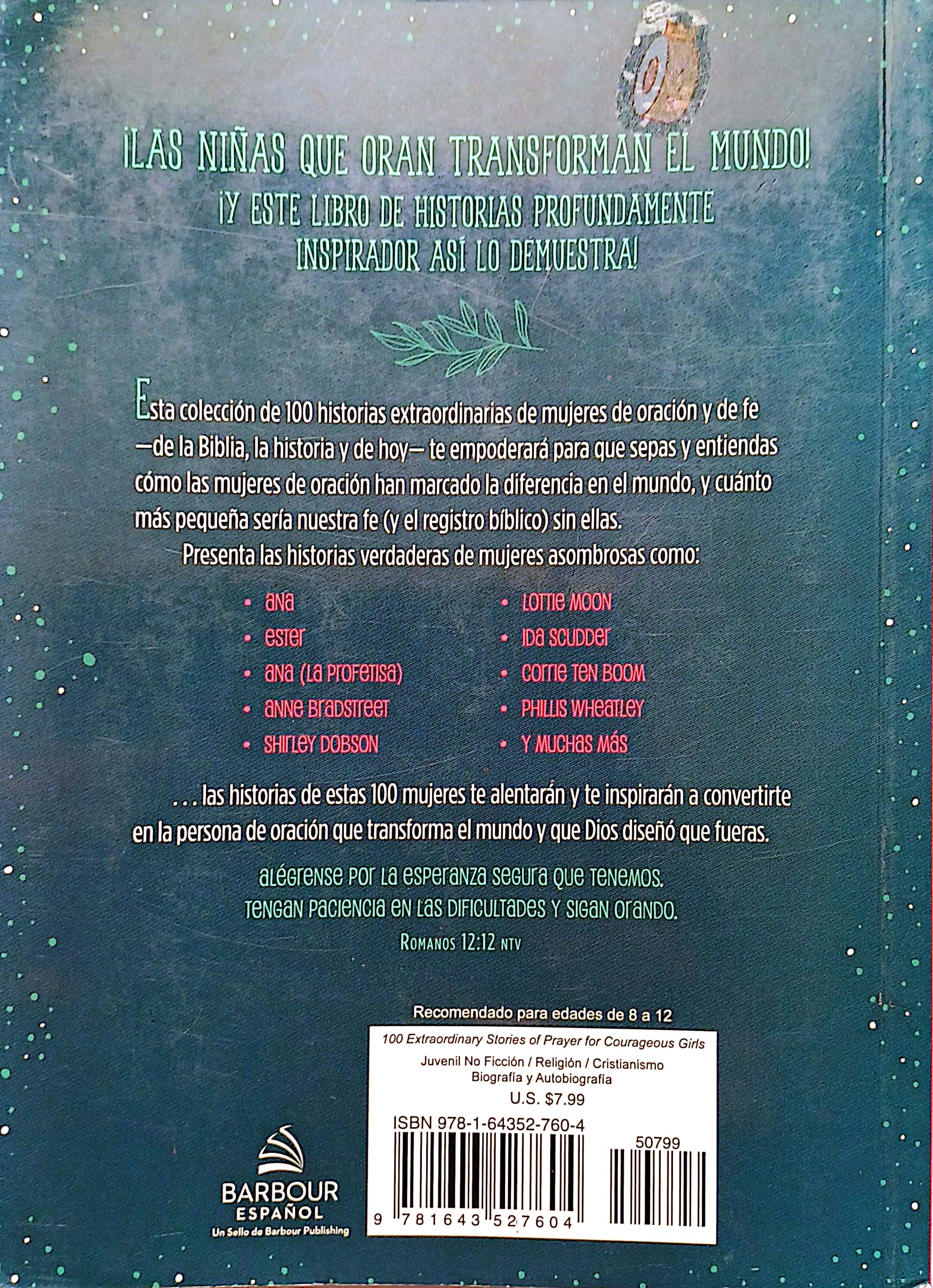 ¡Las niñas que oran transforman el mundo! ¡Y este libro de historias profundamente inspirador así lo demuestra! Ideal para las niñas de tu vida, de ocho años en adelante, esta colección de 100 historias extraordinarias de mujeres de oración y de fe —de la Biblia, la historia y de hoy— empoderarán a las niñas que saben y entienden cómo las mujeres de oración han marcado la diferencia en el mundo, y cuánto más pequeña sería nuestra fe (y el registro bíblico) sin ellas. ¡Con ilustraciones a toda plana y a todo color, junto a las verdaderas historias de oración como Ana, Ester, Anne Bradstreet, Shirley Dobson, Lottie Moon, Ida Scudder, Corrie ten Boom, Phillis Wheatley y muchas más, las historias de estas 100 mujeres alentarán e inspirarán a las niñas a convertirse en las transformadoras del mundo mediante la oración que Dios diseñó que fueran!
