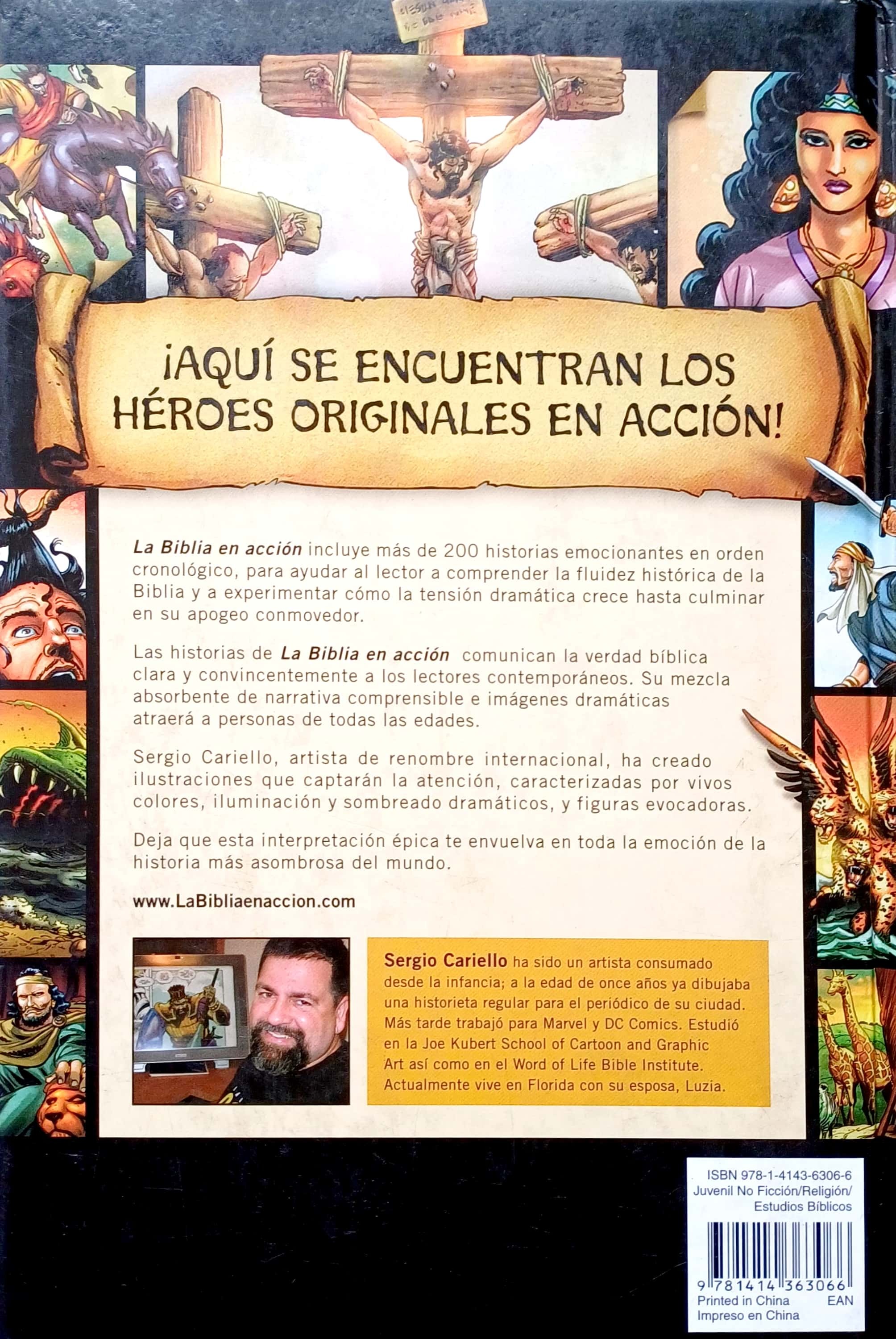 La Biblia en acción incluye más de 200 historias emocionantes en orden cronológico, para ayudar al lector a comprender la fluidez histórica de la Biblia y a experimentar cómo la tensión dramática crece hasta culminar en su apogeo conmovedor. Las historias de La Biblia en acción comunican la verdad bíblica clara y convincentemente a los lectores contemporáneos. Su mezcla absorbente de narrativa comprensible e imágenes dramáticas atraerá a personas de todas las edades.Sergio Cariello, artista de renombre internacional, ha creado ilustraciones que captarán la atención, caracterizadas por vivos colores, iluminación y sombreado dramáticos, y figuras evocadoras. Deja que esta interpretación épica te envuelva en toda la emoción de la historia más asombrosa del mundo.