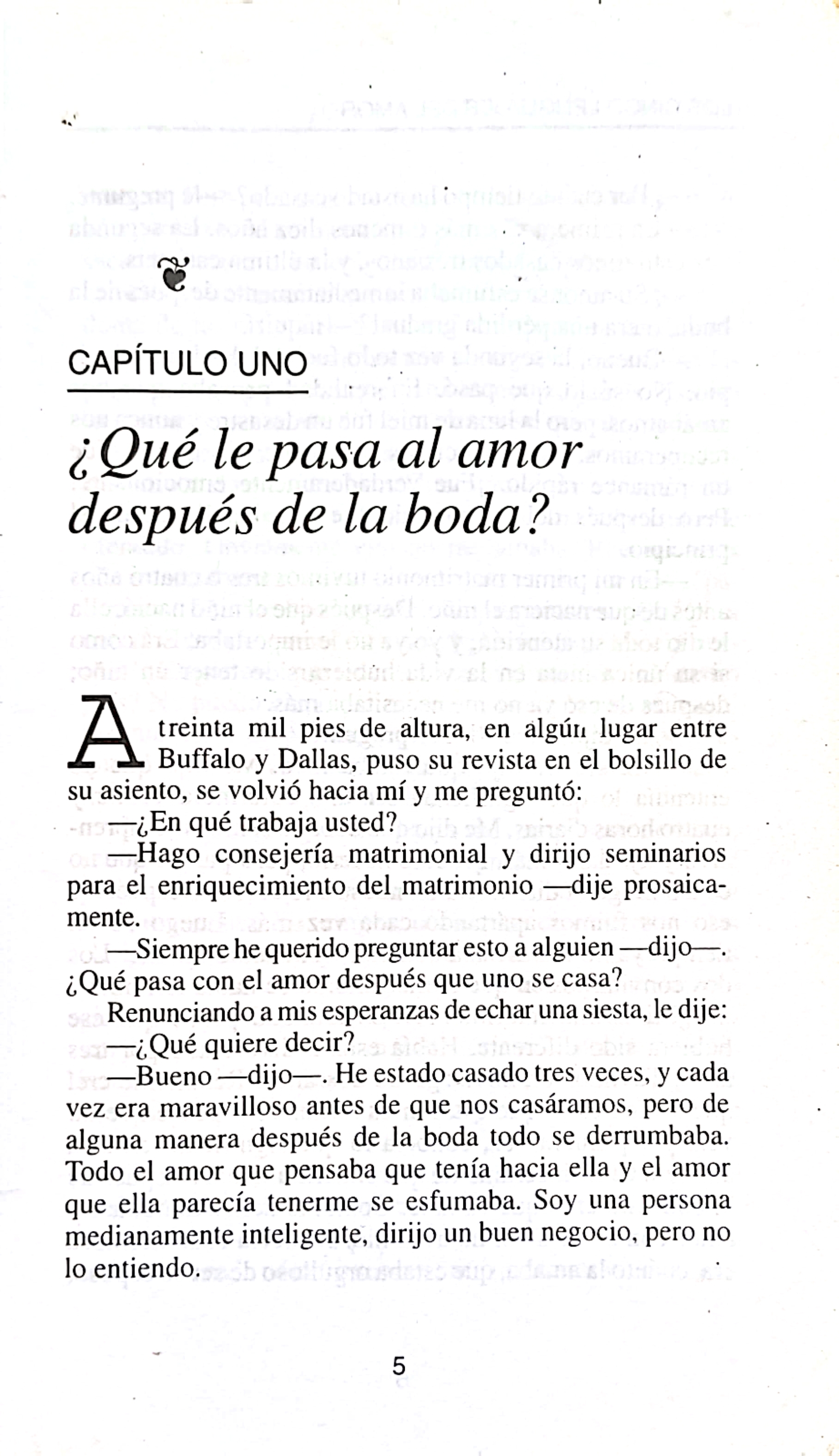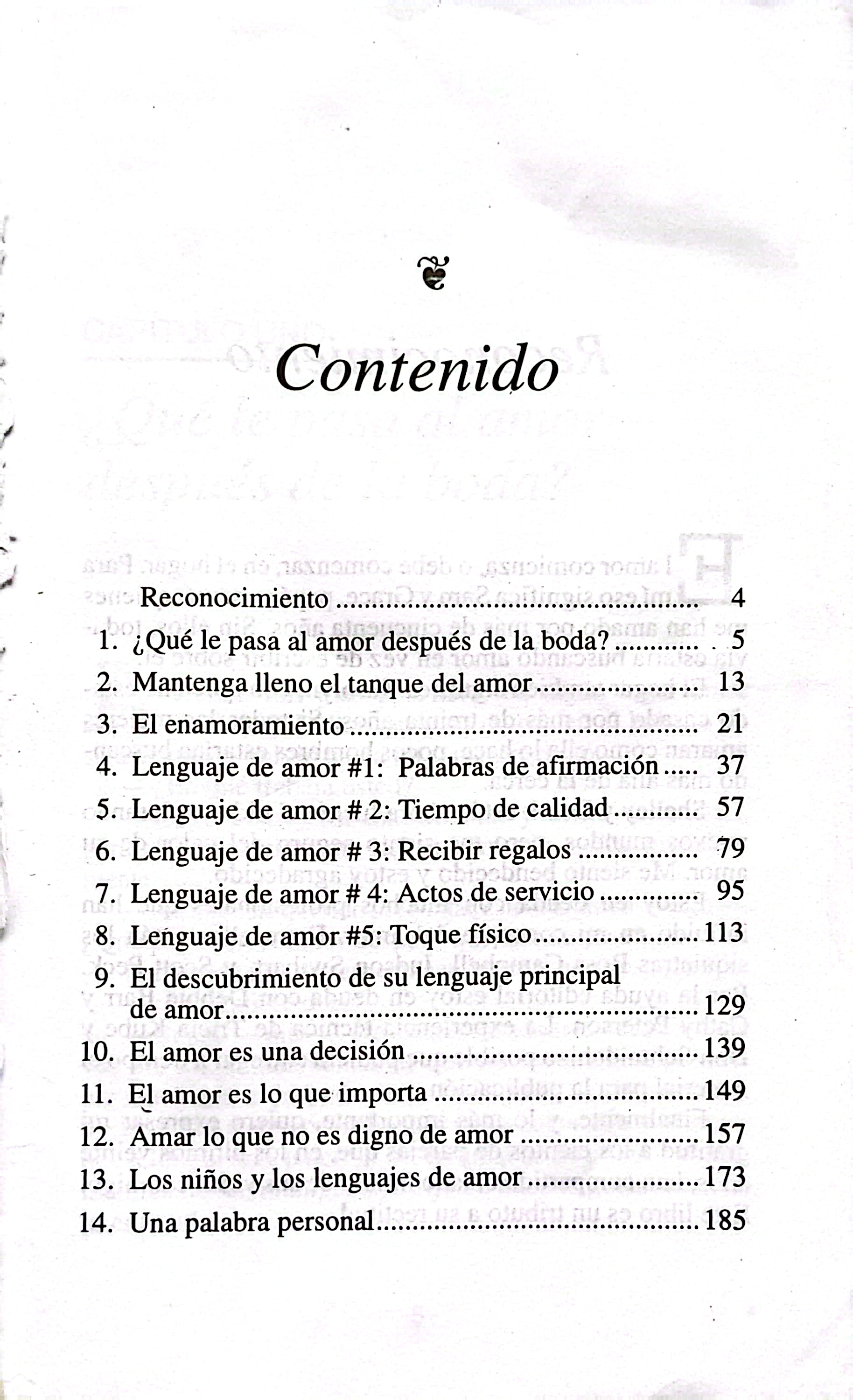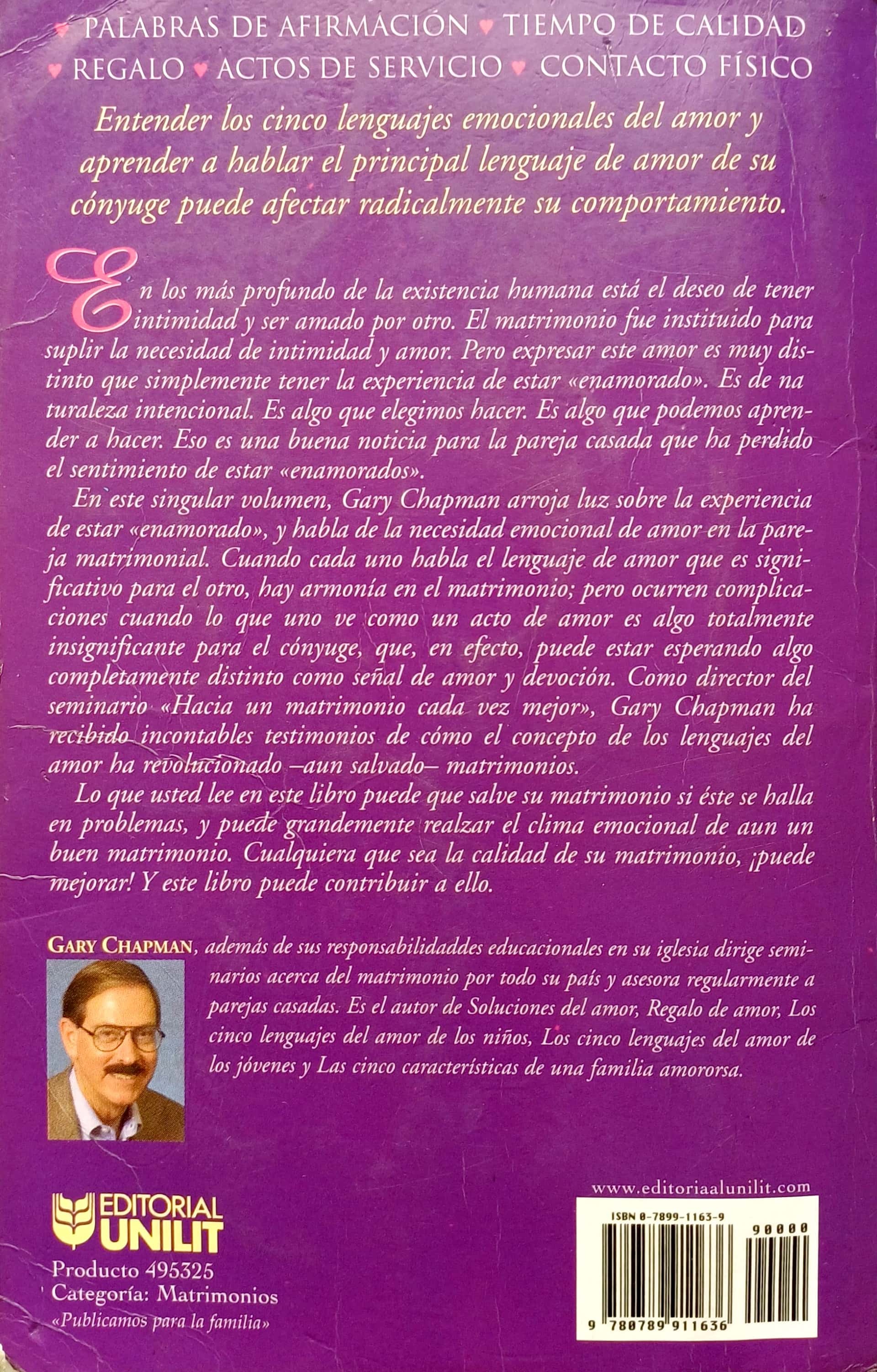 Entre las agendas ocupadas y los largos días, las expresiones de amor pueden quedarse a mitad de camino. Nos olvidamos de elogiar, de dar regalos «solo porque sí», de posponer nuestro abrazo. Las cosas que dicen «Te amo» parecen que no se declaran o no se comunican. Este es un libro acerca de decirlo, y escucharlo, con claridad. Sin trucos. Sin psicoanálisis, Solo aprendiendo a expresar amor en el lenguaje de tu cónyuge. Palabras de afirmación, Actos de servicio, Regalos, Tiempo de calidad, Toque físico. Con más de diez millones de ejemplares vendidos, Los 5 lenguajes del amor ha transformado innumerables relaciones. Sus ideas son sencillas y se dan a conocer con claridad y humor, lo cual hace que este libro sea tanto práctico como agradable. Te inspirarás con las historias de la vida real y te alentarás por su enfoque con sentido común. La lectura de este libro te parecerá como un paseo que das con un amigo sabio. Al aplicarlo cambiará para siempre tu relación... a partir de hoy.