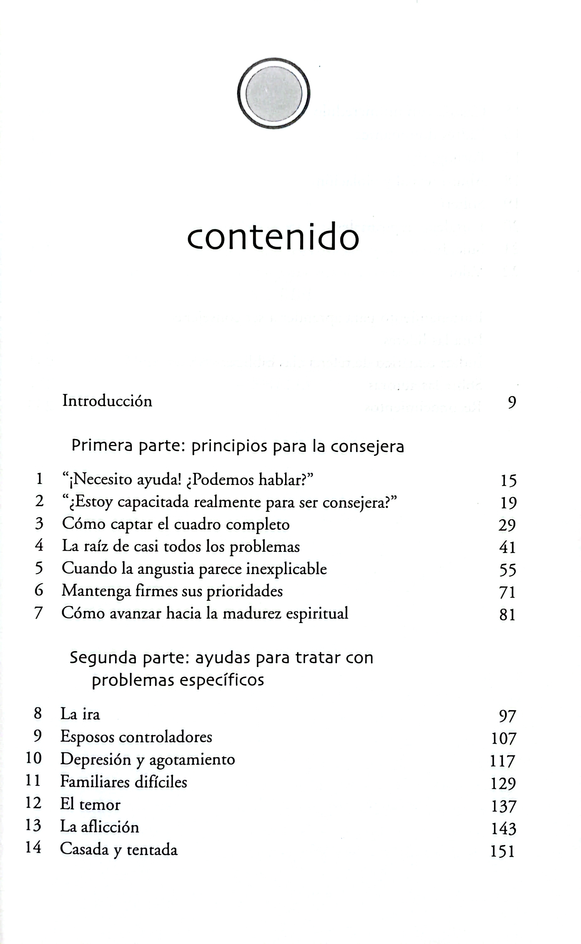 Si a usted le gusta ayudar a otras mujeres en sus problemas pero a veces no sabe qué decirles, ¡este libro es para usted!. Le mostrará qué preguntas hacer y qué pasajes bíblicos citar para aconsejar sobre muchos de los problemas que enfrentan las mujeres.